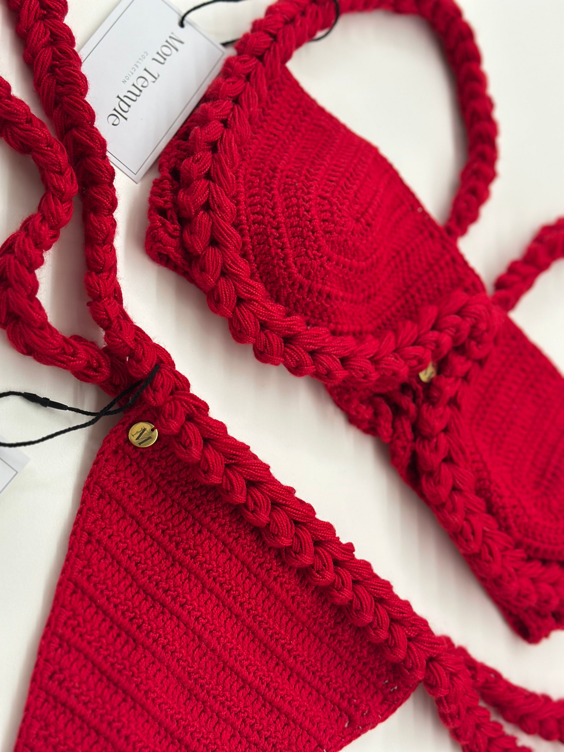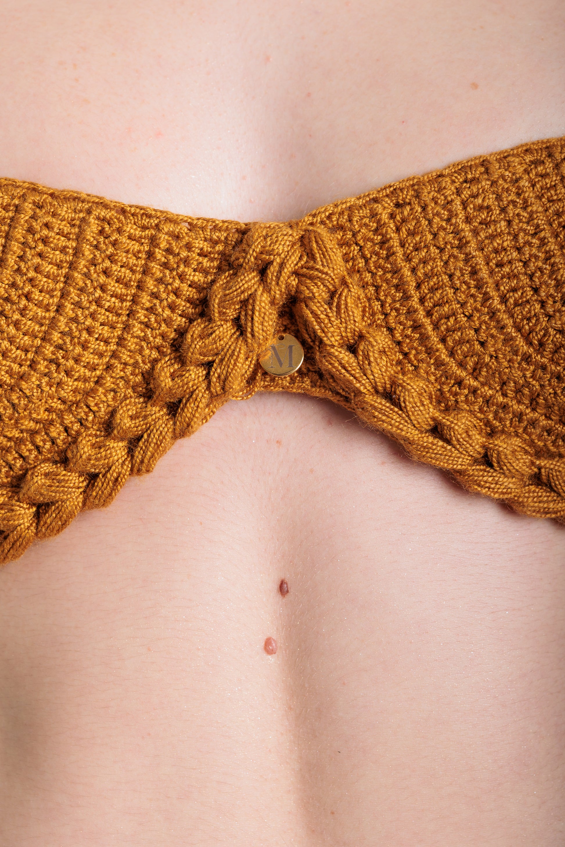 El bikini Artemisa es una pieza que evoca la elegancia de las diosas griegas con un toque terrenal. Tejido a mano en un tono marrón cálido, su diseño trenzado realza la silueta con fuerza y armonía. Es la combinación perfecta entre sofisticación y lo bohemio.